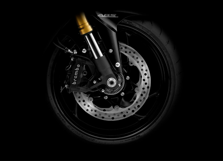 GSX-S1000F possui as mesmas pinças de freios top de linha da Brembo que a GSX-R1000. Cada pinça possui quatro pistões opostos de 32mm atuando em um disco de 310mm gerando um grande poder de frenagem.