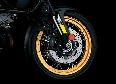 As pinças de freio radiais Tokico de quatro pistões e discos duplos de 310mm de diâmetro na dianteira e disco único de 260mm de diâmetro com uma pinça de um pistão na traseira, providenciam um desempenho de frenagem potente e controlável.